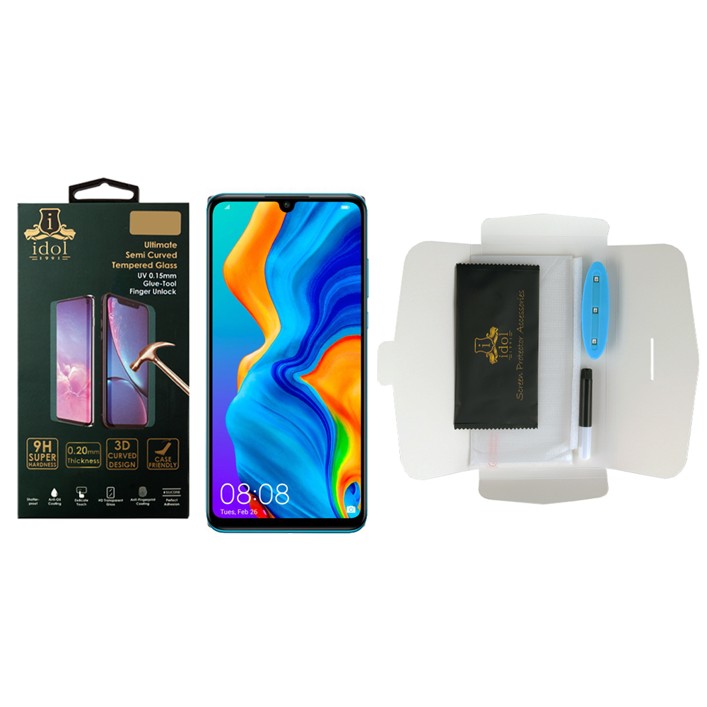 TEMPERED UV GLASS HUAWEI P30 LITE 6.15" 9H 0.15mm 7D SEMI WITH GLUE-TOOL FINGER UNLOCK FULL COVER TRANSPARENT