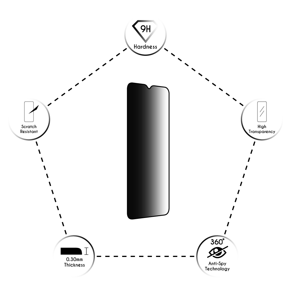 Το συγκεκριμένο Tempered Glass χρησιμεύει ως φίλτρο πόλωσης και εμποδίζει το φως όταν κάποιος κοιτάζει την οθόνη από το πλάι έως και 360ο. Είναι σχεδιασμένο έτσι ώστε να είναι απόλυτα συμβατό με θήκες που διαθέτουν ανασηκωμένες άκρες για την προστασία της οθόνης του κινητού. Έχει υψηλό βαθμό σκληρότητας 9H και συνεπώς είναι πολύ δύσκολο να γρατσουνιστεί ή ακόμη και να σπάσει. Ακόμη και στην περίπτωση που με κάποιο δυνατό χτύπημα σπάσει, γίνεται πολύ μικρά κομμάτια, χωρίς όμως να διασκορπίζεται, όπως ακριβώς και το παρμπρίζ του αυτοκινήτου, έτσι ώστε να μην υπάρχει κίνδυνος τραυματισμού του χρήστη ή γρατσουνίσματος της οθόνης.