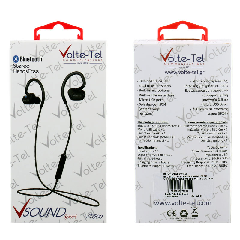 Ξεπεράστε τα όρια με τα νέα μοντέρνα ασύρματα αθλητικά ακουστικά STEREO BLUETOOTH V SOUND SPORT VT600. Χάρη στη γερή και ανθεκτική κατασκευή τους τα ακουστικά V Sound Sport θα σας ενθουσιάσουν. Είναι αδιάβροχα IPX4 (ανθεκτικά σε σταγόνες νερού) και μπορούν να ανταπεξέλθουν σε δύσκολα προγράμματα εκγύμνασης, όπως τρέξιμο, ποδηλασία ακόμα και σε ένα μάθημα αεροβικής. Διαθέτει ασύρματη σύνδεση Bluetooth v4.1 και επαναφορτιζόμενη μπαταρία για αναμονή 130 ωρών και για χρήση έως και 5 ώρες χωρίς διακοπή για να μην χάνετε καμία κλήση ενώ ακούτε μουσική. Τα εργονομικά άγκιστρα για το αυτί στερεώνουν τα ακουστικά στη θέση τους, ακόμα και κατά την εξαιρετικά έντονη γυμναστική. Το ενσωματωμένο χειριστήριο σας βοηθά να αυξομειώνετε τον ήχο ή να αλλάζετε πολύ εύκολα τραγούδι ή σταθμό, να κάνετε pairing και να σταματάτε την αναπαραγωγή μουσικής. Τέλος το μικρόφωνο που βρίσκεται ενσωματωμένο στο ακουστικό φροντίζει ώστε ο συνομιλητής σας να σας ακούει δυνατά και καθαρά ακόμη και αν βρίσκεστε σε κίνηση. Τα μοντέρνα ασύρματα αθλητικά ακουστικά θα γίνουν το αγαπημένο σας αξεσουάρ, το οποίο θα θέλετε να χρησιμοποιείτε με το MP3/MP4, το κινητό τηλέφωνο ή το smartphone σας για να ακούτε μουσική, με τον Η/Υ σας όσο θα παίζετε παιχνίδια ή να κάνετε online κλήσεις (skype κ.α.), χωρίς να ενοχλείτε τους διπλανούς σας. Τα V Sound Sport είναι διαθέσιμα σε 6 χρώματα μαύρο, άσπρο, μπλε, πορτοκαλί, ροζ, και κόκκινο για να τα συνδυάζετε ακόμα και με τα ρούχα της γυμναστική σας. Η συσκευασία επίσης περιλαμβάνει δύο ζευγάρια ear buds ανάλογα με το μέγεθος του αυτιού σας ένα καλώδιο Micro USB 1.0m και οδηγίες χρήσης στα Ελληνικά και Αγγλικά.