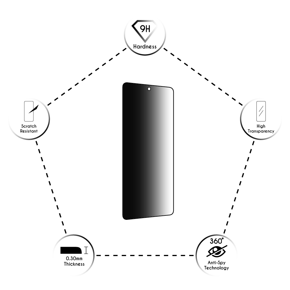 Το συγκεκριμένο Tempered Glass χρησιμεύει ως φίλτρο πόλωσης και εμποδίζει το φως όταν κάποιος κοιτάζει την οθόνη από το πλάι έως και 360ο. Είναι σχεδιασμένο έτσι ώστε να είναι απόλυτα συμβατό με θήκες που διαθέτουν ανασηκωμένες άκρες για την προστασία της οθόνης του κινητού. Έχει υψηλό βαθμό σκληρότητας 9H και συνεπώς είναι πολύ δύσκολο να γρατσουνιστεί ή ακόμη και να σπάσει. Ακόμη και στην περίπτωση που με κάποιο δυνατό χτύπημα σπάσει, γίνεται πολύ μικρά κομμάτια, χωρίς όμως να διασκορπίζεται, όπως ακριβώς και το παρμπρίζ του αυτοκινήτου, έτσι ώστε να μην υπάρχει κίνδυνος τραυματισμού του χρήστη ή γρατσουνίσματος της οθόνης.