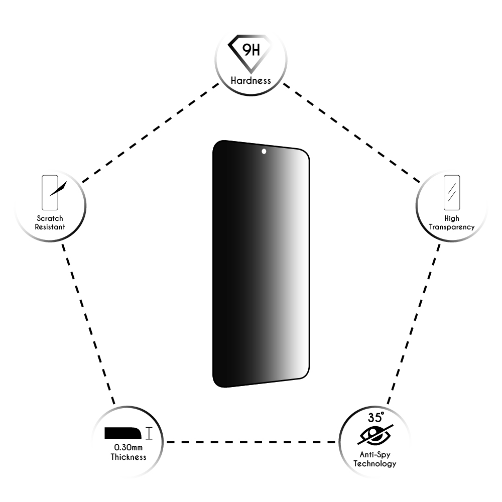 Το συγκεκριμένο Tempered Glass χρησιμεύει ως φίλτρο πόλωσης και εμποδίζει το φως όταν κάποιος κοιτάζει την οθόνη από το πλάι σε γωνία 35ο, είναι σχεδιασμένο έτσι ώστε να είναι απόλυτα συμβατό με θήκες που διαθέτουν ανασηκωμένες άκρες για την προστασία της οθόνης του κινητού.