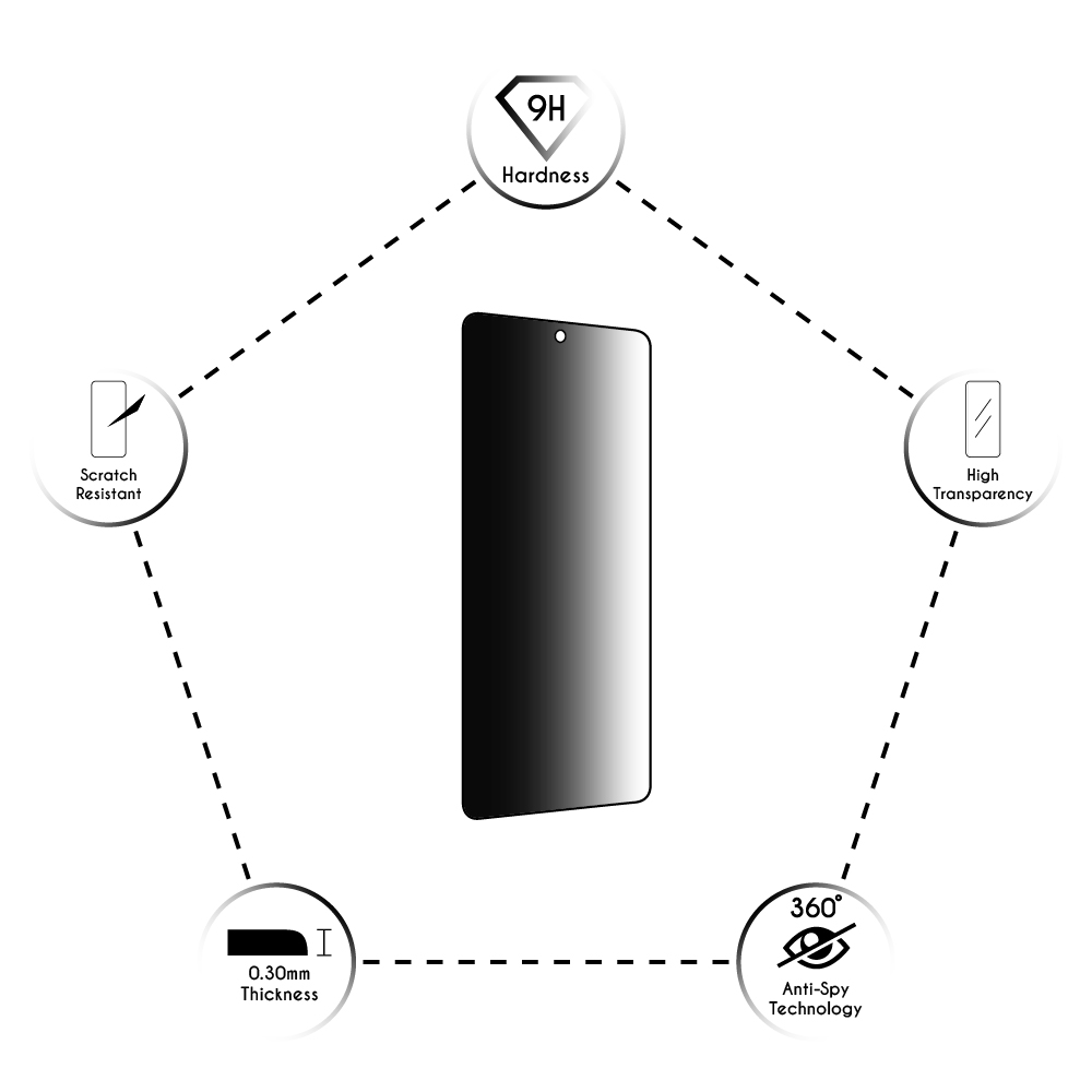 Το συγκεκριμένο Tempered Glass χρησιμεύει ως φίλτρο πόλωσης και εμποδίζει το φως όταν κάποιος κοιτάζει την οθόνη από το πλάι έως και 360ο. Είναι σχεδιασμένο έτσι ώστε να είναι απόλυτα συμβατό με θήκες που διαθέτουν ανασηκωμένες άκρες για την προστασία της οθόνης του κινητού. Έχει υψηλό βαθμό σκληρότητας 9H και συνεπώς είναι πολύ δύσκολο να γρατσουνιστεί ή ακόμη και να σπάσει. Ακόμη και στην περίπτωση που με κάποιο δυνατό χτύπημα σπάσει, γίνεται πολύ μικρά κομμάτια, χωρίς όμως να διασκορπίζεται, όπως ακριβώς και το παρμπρίζ του αυτοκινήτου, έτσι ώστε να μην υπάρχει κίνδυνος τραυματισμού του χρήστη ή γρατσουνίσματος της οθόνης.