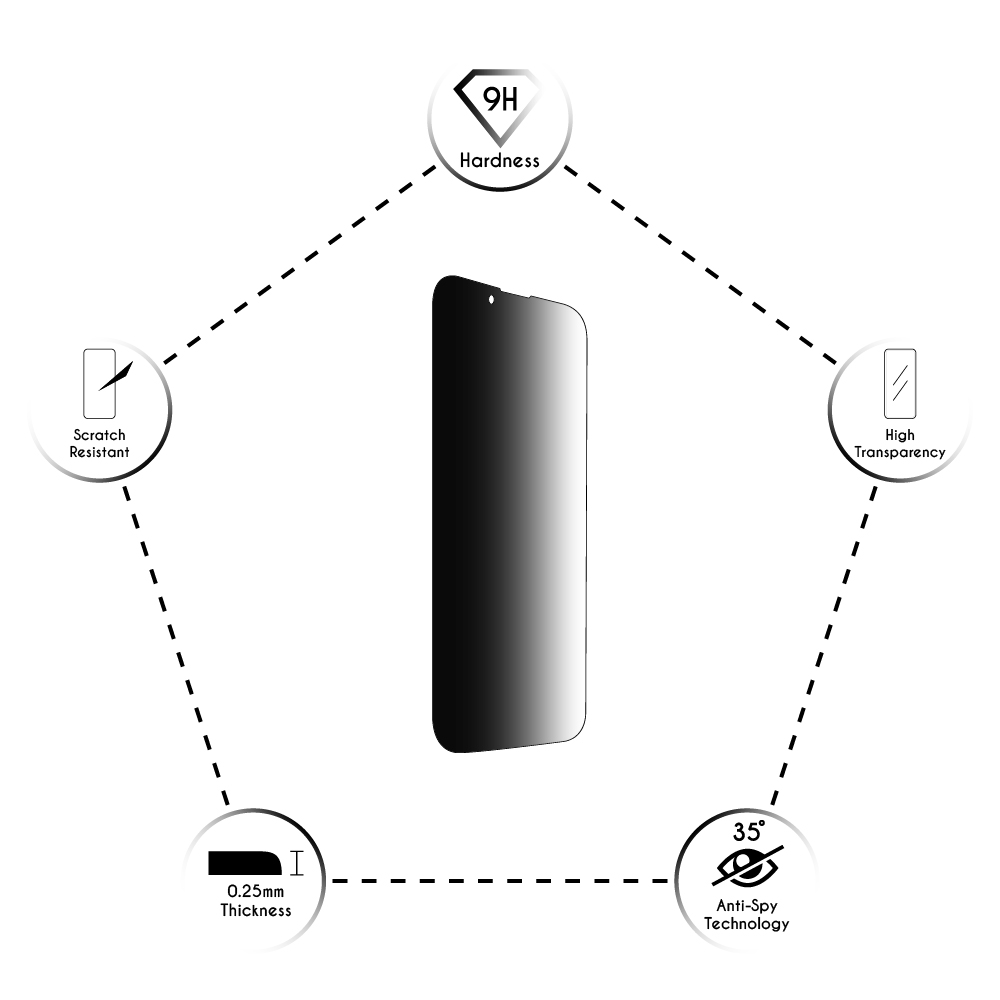 Το συγκεκριμένο Tempered Glass χρησιμεύει ως φίλτρο πόλωσης και εμποδίζει το φως όταν κάποιος κοιτάζει την οθόνη από το πλάι σε γωνία 35ο, είναι σχεδιασμένο έτσι ώστε να είναι απόλυτα συμβατό με θήκες που διαθέτουν ανασηκωμένες άκρες για την προστασία της οθόνης του κινητού.
