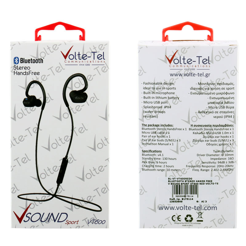 Ξεπεράστε τα όρια με τα νέα μοντέρνα ασύρματα αθλητικά ακουστικά STEREO BLUETOOTH V SOUND SPORT VT600. Χάρη στη γερή και ανθεκτική κατασκευή τους τα ακουστικά V Sound Sport θα σας ενθουσιάσουν. Είναι αδιάβροχα IPX4 (ανθεκτικά σε σταγόνες νερού) και μπορούν να ανταπεξέλθουν σε δύσκολα προγράμματα εκγύμνασης, όπως τρέξιμο, ποδηλασία ακόμα και σε ένα μάθημα αεροβικής. Διαθέτει ασύρματη σύνδεση Bluetooth v4.1 και επαναφορτιζόμενη μπαταρία για αναμονή 130 ωρών και για χρήση έως και 5 ώρες χωρίς διακοπή για να μην χάνετε καμία κλήση ενώ ακούτε μουσική. Τα εργονομικά άγκιστρα για το αυτί στερεώνουν τα ακουστικά στη θέση τους, ακόμα και κατά την εξαιρετικά έντονη γυμναστική. Το ενσωματωμένο χειριστήριο σας βοηθά να αυξομειώνετε τον ήχο ή να αλλάζετε πολύ εύκολα τραγούδι ή σταθμό, να κάνετε pairing και να σταματάτε την αναπαραγωγή μουσικής. Τέλος το μικρόφωνο που βρίσκεται ενσωματωμένο στο ακουστικό φροντίζει ώστε ο συνομιλητής σας να σας ακούει δυνατά και καθαρά ακόμη και αν βρίσκεστε σε κίνηση. Τα μοντέρνα ασύρματα αθλητικά ακουστικά θα γίνουν το αγαπημένο σας αξεσουάρ, το οποίο θα θέλετε να χρησιμοποιείτε με το MP3/MP4, το κινητό τηλέφωνο ή το smartphone σας για να ακούτε μουσική, με τον Η/Υ σας όσο θα παίζετε παιχνίδια ή να κάνετε online κλήσεις (skype κ.α.), χωρίς να ενοχλείτε τους διπλανούς σας. Τα V Sound Sport είναι διαθέσιμα σε 6 χρώματα μαύρο, άσπρο, μπλε, πορτοκαλί, ροζ, και κόκκινο για να τα συνδυάζετε ακόμα και με τα ρούχα της γυμναστική σας. Η συσκευασία επίσης περιλαμβάνει δύο ζευγάρια ear buds ανάλογα με το μέγεθος του αυτιού σας ένα καλώδιο Micro USB 1.0m και οδηγίες χρήσης στα Ελληνικά και Αγγλικά.