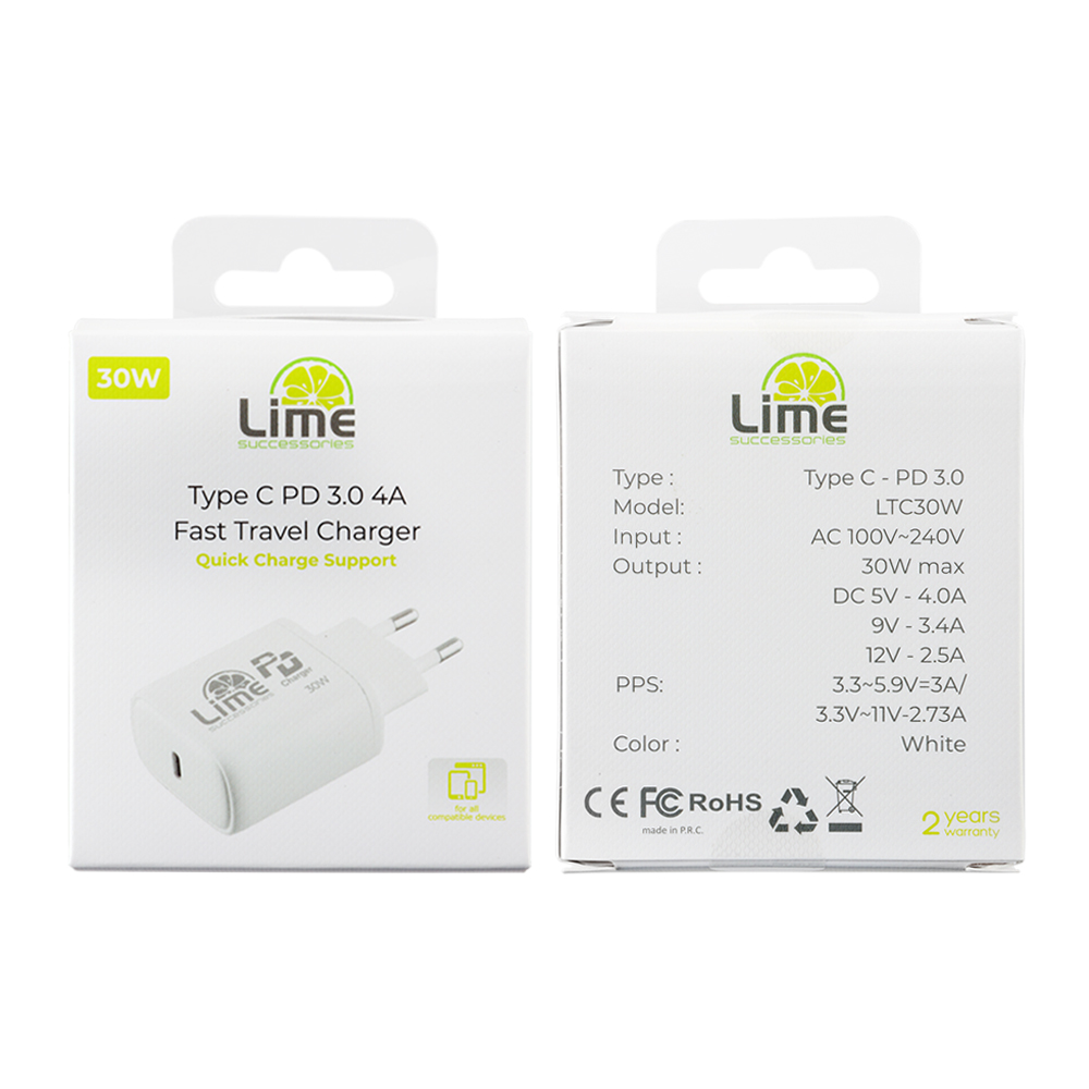 Ο νέος φορτιστής της LIME SUCCESSORIES TYPE C PD 3.0 SUPER FAST CHARGER QC 3.0 LTC30 30W 4000mA σας επιτρέπει να φορτίσετε τη συσκευή σας μέσω υποδοχής TYPE C γρήγορα και αποτελεσματικά.
