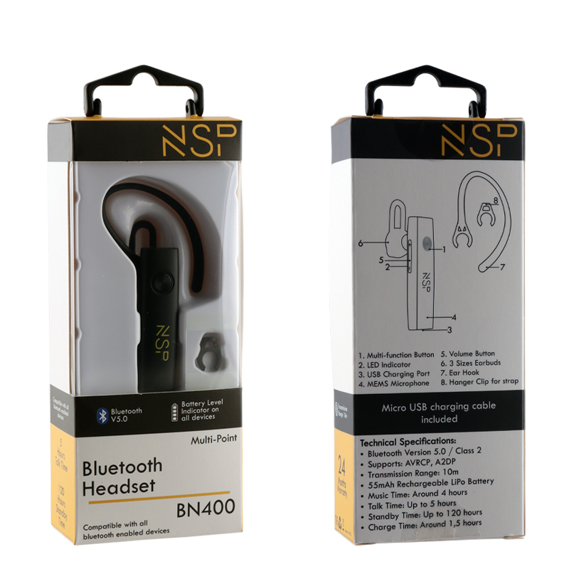 Με το νέο Bluetooth ακουστικό NSP BN400 θα βιώσεις απαράμιλλη ευχρηστία και αναβαθμισμένη επικοινωνία όπως ποτέ άλλοτε. Είναι εξοπλισμένο με ασύρματη τεχνολογία Bluetooth v5.0 η οποία του επιτρέπει να λειτουργεί σε εμβέλεια έως και 10 μέτρα από το σημείο που βρίσκεται το smartphone σου, ενώ η επαναφορτιζόμενη μπαταρία που διαθέτει υπόσχεται αντοχή δίχως προηγούμενο, μέχρι 5 ώρες ομιλίας και 120 ώρες αναμονής. Επιπλέον η λειτουργία power display που διαθέτει σου δίνει τη δυνατότητα να παρακολουθείς το επίπεδο μπαταρίας του Bluetooth από την οθόνη του κινητού σου! Τοποθετείται με εξαιρετική ευκολία και άνεση, είτε με το εργονομικού σχεδιασμού άγκιστρο πίσω από το αυτί σου είτε χωρίς αυτό. Εναλλάξιμο σε κάθε αυτί διατηρώντας σταθερή την ποιότητα του ήχου. Και για τους πιο απαιτητικούς χρήστες διαθέτει ένα (1) hanger clip που μπορείς να το περάσεις σε λουράκι και να το κρεμάσεις στον λαιμό σου.