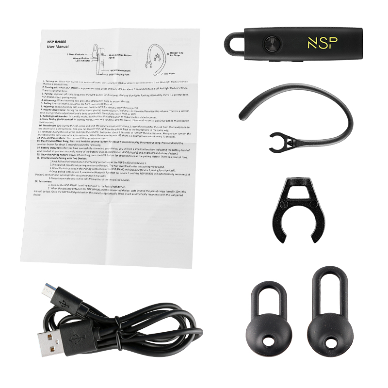 Στη συσκευασία του NSP BN-400 θα βρεις ένα (1) ear hook, ένα (1) hanger clip για το κορδόνι του λαιμού, δύο (2) διαφορετικού μεγέθους μαξιλαράκια σιλικόνης (Small/Large) για να τα αντικαταστήσεις όποτε αυτό χρειαστεί, και ένα (1) καλώδιο Micro USB για φόρτιση.