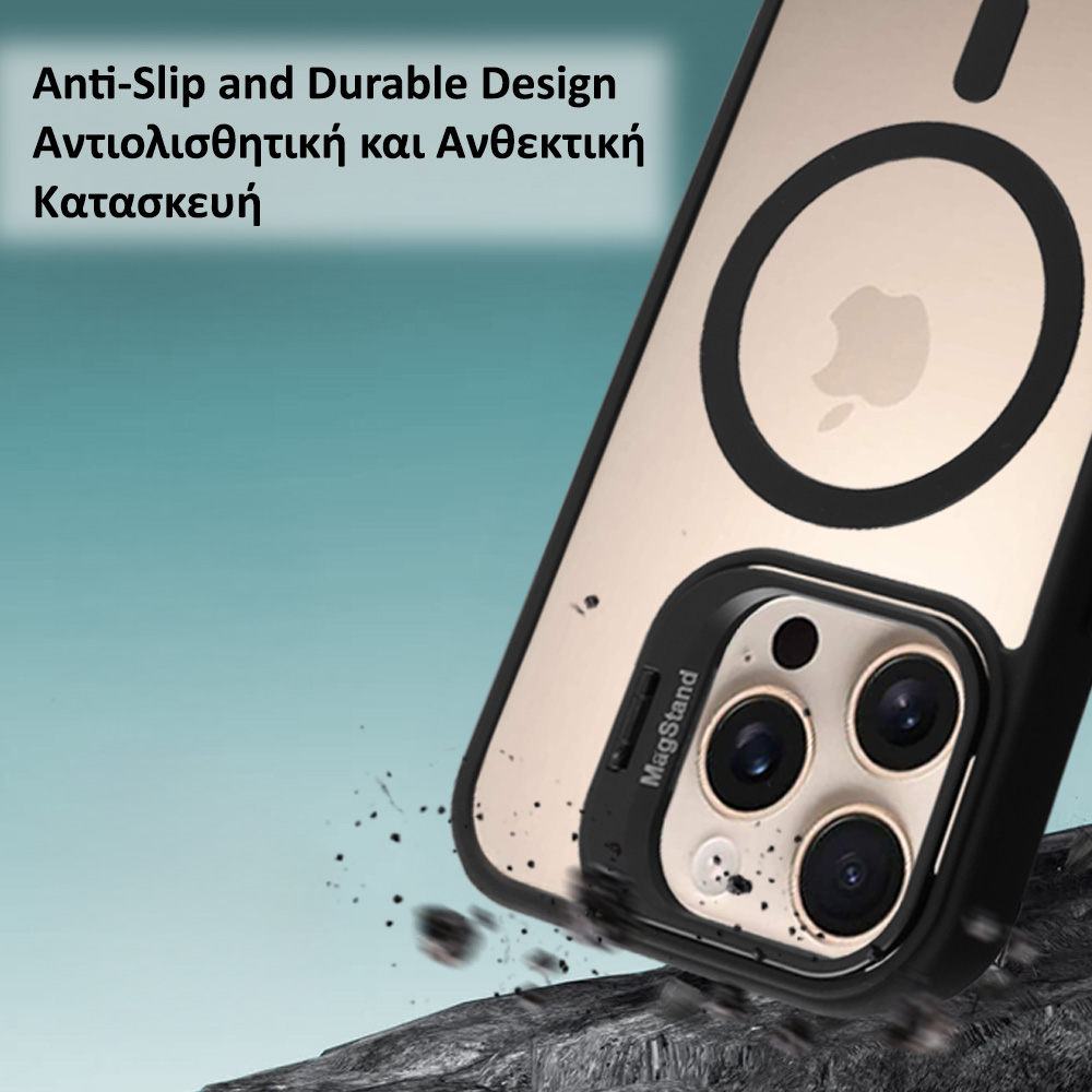 Το ενσωματωμένο μεταλλικό πλαίσιο της κάμερας αποτελεί ένα από τα πιο καινοτόμα στοιχεία της θήκης. Ανοίγει ομαλά και μετατρέπεται σε σταθερή βάση στήριξης, προσφέροντας άνετη προβολή περιεχομένου τόσο σε οριζόντια όσο και σε κάθετη θέση. Παράλληλα όμως, λειτουργεί και ως έξυπνη λαβή μεταφοράς. Χάρη στον εργονομικό του σχεδιασμό, μπορείτε να περάσετε το δάχτυλό σας μέσα από το μεταλλικό πλαίσιο και να κρατήσετε το κινητό με μεγαλύτερη ασφάλεια, ακόμη και όταν τα χέρια σας είναι γεμάτα ή βρίσκεστε εν κινήσει. Έτσι μειώνεται σημαντικά ο κίνδυνος πτώσης, ενώ η χρήση με ένα χέρι γίνεται πιο άνετη και ξεκούραστη. Όταν δεν χρησιμοποιείται, το πλαίσιο κλείνει διακριτικά και εφαρμόζει απόλυτα στη θήκη, διατηρώντας το λεπτό και κομψό της προφίλ.