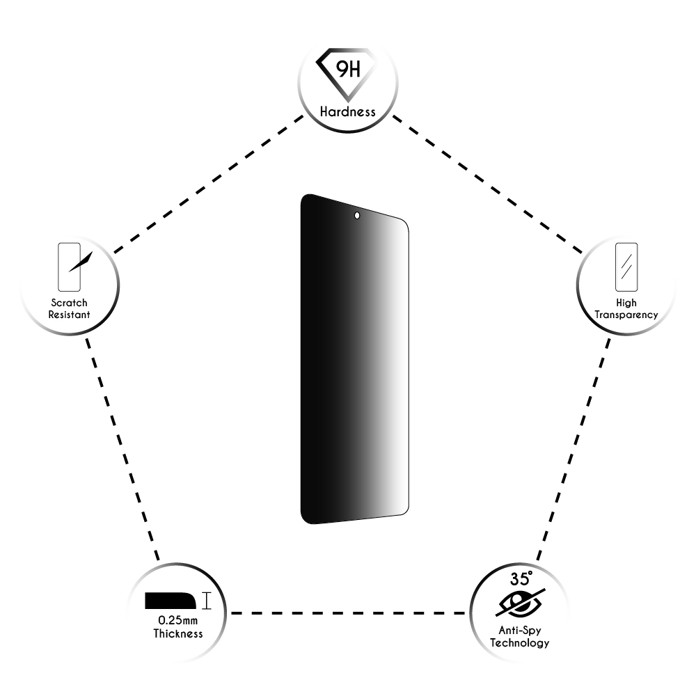 Το συγκεκριμένο Tempered Glass χρησιμεύει ως φίλτρο πόλωσης και εμποδίζει το φως όταν κάποιος κοιτάζει την οθόνη από το πλάι σε γωνία 35ο, είναι σχεδιασμένο έτσι ώστε να είναι απόλυτα συμβατό με θήκες που διαθέτουν ανασηκωμένες άκρες για την προστασία της οθόνης του κινητού.