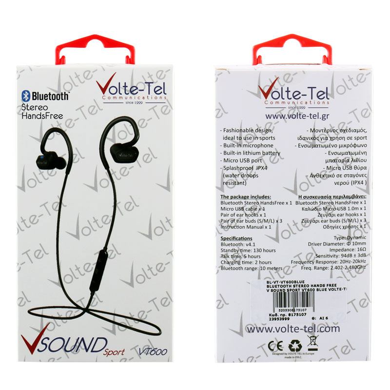 Ξεπεράστε τα όρια με τα νέα μοντέρνα ασύρματα αθλητικά ακουστικά STEREO BLUETOOTH V SOUND SPORT VT600. Χάρη στη γερή και ανθεκτική κατασκευή τους τα ακουστικά V Sound Sport θα σας ενθουσιάσουν. Είναι αδιάβροχα IPX4 (ανθεκτικά σε σταγόνες νερού) και μπορούν να ανταπεξέλθουν σε δύσκολα προγράμματα εκγύμνασης, όπως τρέξιμο, ποδηλασία ακόμα και σε ένα μάθημα αεροβικής. Διαθέτει ασύρματη σύνδεση Bluetooth v4.1 και επαναφορτιζόμενη μπαταρία για αναμονή 130 ωρών και για χρήση έως και 5 ώρες χωρίς διακοπή για να μην χάνετε καμία κλήση ενώ ακούτε μουσική. Τα εργονομικά άγκιστρα για το αυτί στερεώνουν τα ακουστικά στη θέση τους, ακόμα και κατά την εξαιρετικά έντονη γυμναστική. Το ενσωματωμένο χειριστήριο σας βοηθά να αυξομειώνετε τον ήχο ή να αλλάζετε πολύ εύκολα τραγούδι ή σταθμό, να κάνετε pairing και να σταματάτε την αναπαραγωγή μουσικής. Τέλος το μικρόφωνο που βρίσκεται ενσωματωμένο στο ακουστικό φροντίζει ώστε ο συνομιλητής σας να σας ακούει δυνατά και καθαρά ακόμη και αν βρίσκεστε σε κίνηση. Τα μοντέρνα ασύρματα αθλητικά ακουστικά θα γίνουν το αγαπημένο σας αξεσουάρ, το οποίο θα θέλετε να χρησιμοποιείτε με το MP3/MP4, το κινητό τηλέφωνο ή το smartphone σας για να ακούτε μουσική, με τον Η/Υ σας όσο θα παίζετε παιχνίδια ή να κάνετε online κλήσεις (skype κ.α.), χωρίς να ενοχλείτε τους διπλανούς σας. Τα V Sound Sport είναι διαθέσιμα σε 6 χρώματα μαύρο, άσπρο, μπλε, πορτοκαλί, ροζ, και κόκκινο για να τα συνδυάζετε ακόμα και με τα ρούχα της γυμναστική σας. Η συσκευασία επίσης περιλαμβάνει δύο ζευγάρια ear buds ανάλογα με το μέγεθος του αυτιού σας ένα καλώδιο Micro USB 1.0m και οδηγίες χρήσης στα Ελληνικά και Αγγλικά.