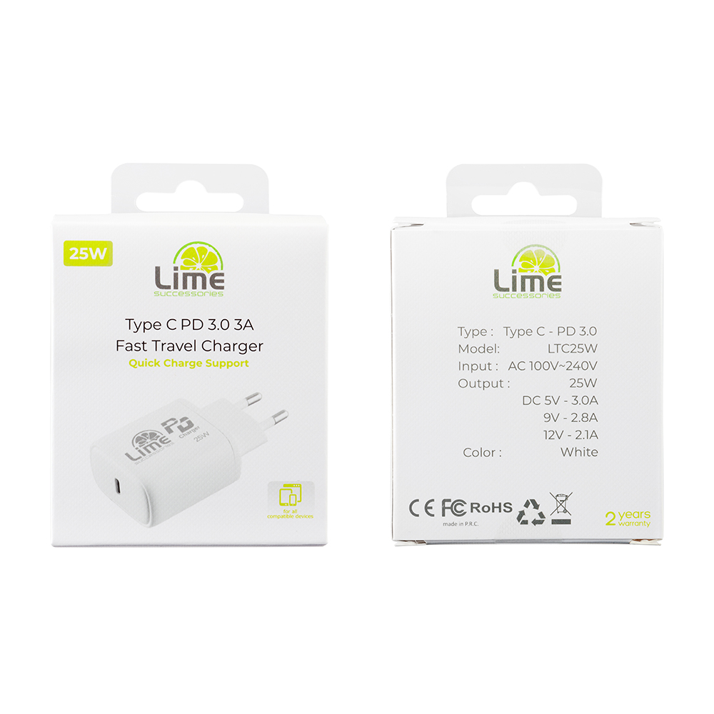 Ο νέος φορτιστής της LIME SUCCESSORIES TYPE C PD 3.0 FAST CHARGER QC 3.0 LTC25 25W 3000mA σας επιτρέπει να φορτίσετε τη συσκευή σας μέσω υποδοχής TYPE C γρήγορα και αποτελεσματικά.