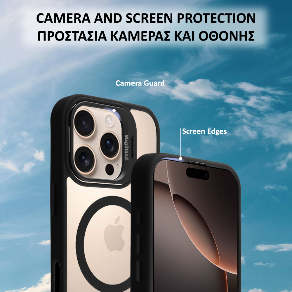 Το ενσωματωμένο μεταλλικό πλαίσιο της κάμερας αποτελεί ένα από τα πιο καινοτόμα στοιχεία της θήκης. Ανοίγει ομαλά και μετατρέπεται σε σταθερή βάση στήριξης, προσφέροντας άνετη προβολή περιεχομένου τόσο σε οριζόντια όσο και σε κάθετη θέση. Παράλληλα όμως, λειτουργεί και ως έξυπνη λαβή μεταφοράς. Χάρη στον εργονομικό του σχεδιασμό, μπορείτε να περάσετε το δάχτυλό σας μέσα από το μεταλλικό πλαίσιο και να κρατήσετε το κινητό με μεγαλύτερη ασφάλεια, ακόμη και όταν τα χέρια σας είναι γεμάτα ή βρίσκεστε εν κινήσει. Έτσι μειώνεται σημαντικά ο κίνδυνος πτώσης, ενώ η χρήση με ένα χέρι γίνεται πιο άνετη και ξεκούραστη. Όταν δεν χρησιμοποιείται, το πλαίσιο κλείνει διακριτικά και εφαρμόζει απόλυτα στη θήκη, διατηρώντας το λεπτό και κομψό της προφίλ.