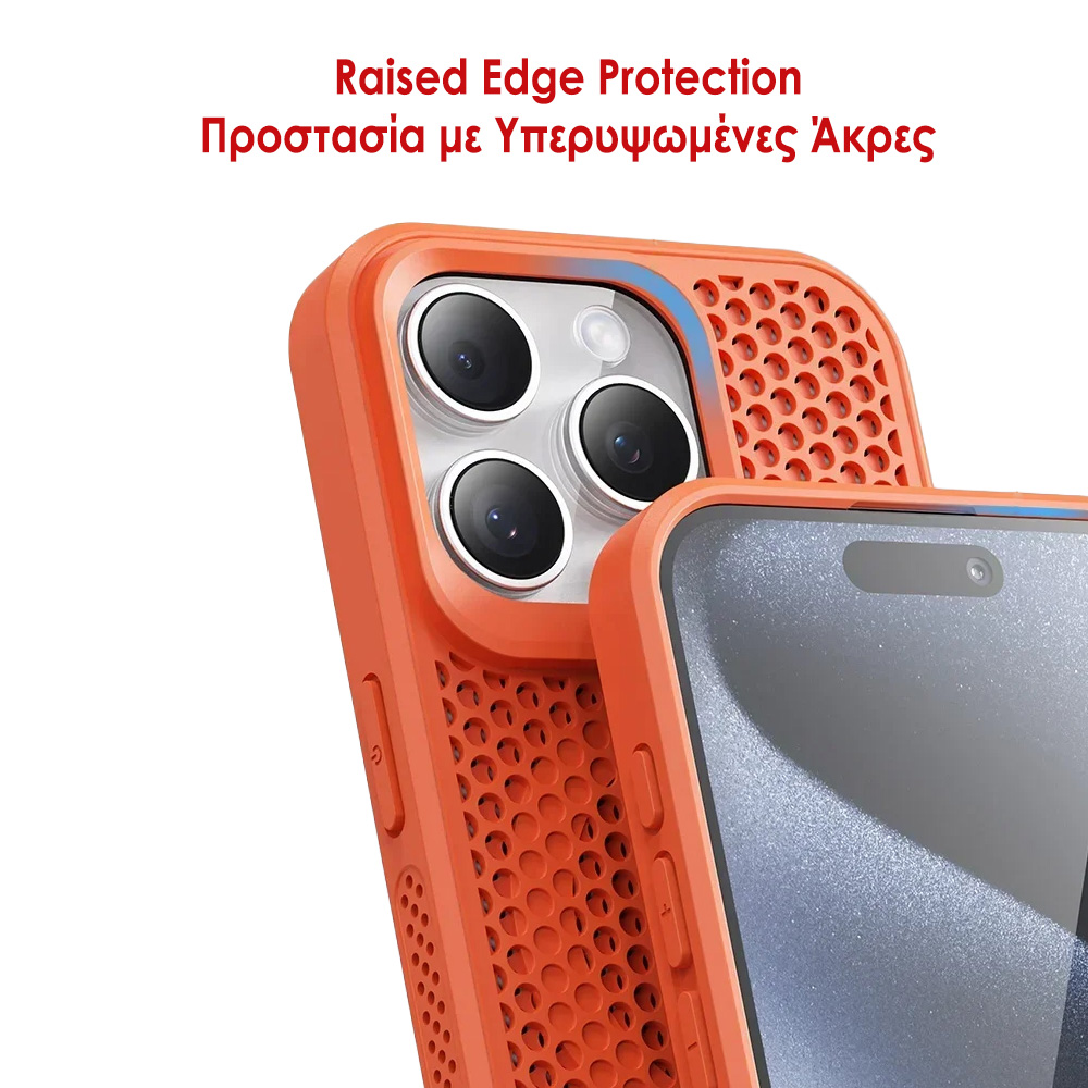 Η θήκη διαθέτει ανασηκωμένες προστατευτικές άκρες: Στο πίσω μέρος γύρω από την κάμερα, ώστε να αποτρέπεται η άμεση επαφή με επιφάνειες. Στο μπροστινό μέρος γύρω από την οθόνη, για επιπλέον ασφάλεια σε πτώσεις και τοποθέτηση ανάποδα. Έτσι προσφέρει ολοκληρωμένη προστασία 360° χωρίς να προσθέτει περιττό όγκο.