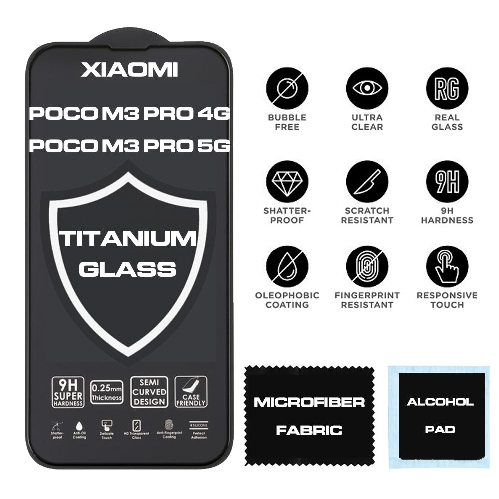 TITANIUM TEMPERED GLASS XIAOMI POCO M3 PRO 4G / POCO M3 PRO 5G 6.5" 9H 0.25mm FULL FACE FULL GLUE SEMI CURVED BLACK