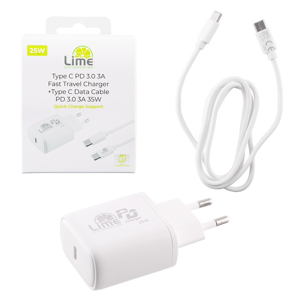 Ο νέος φορτιστής της LIME SUCCESSORIES TYPE C PD 3.0 FAST CHARGER QC 3.0 LTC25 25W 3000mA σας επιτρέπει να φορτίσετε τη συσκευή σας μέσω υποδοχής TYPE C γρήγορα και αποτελεσματικά.