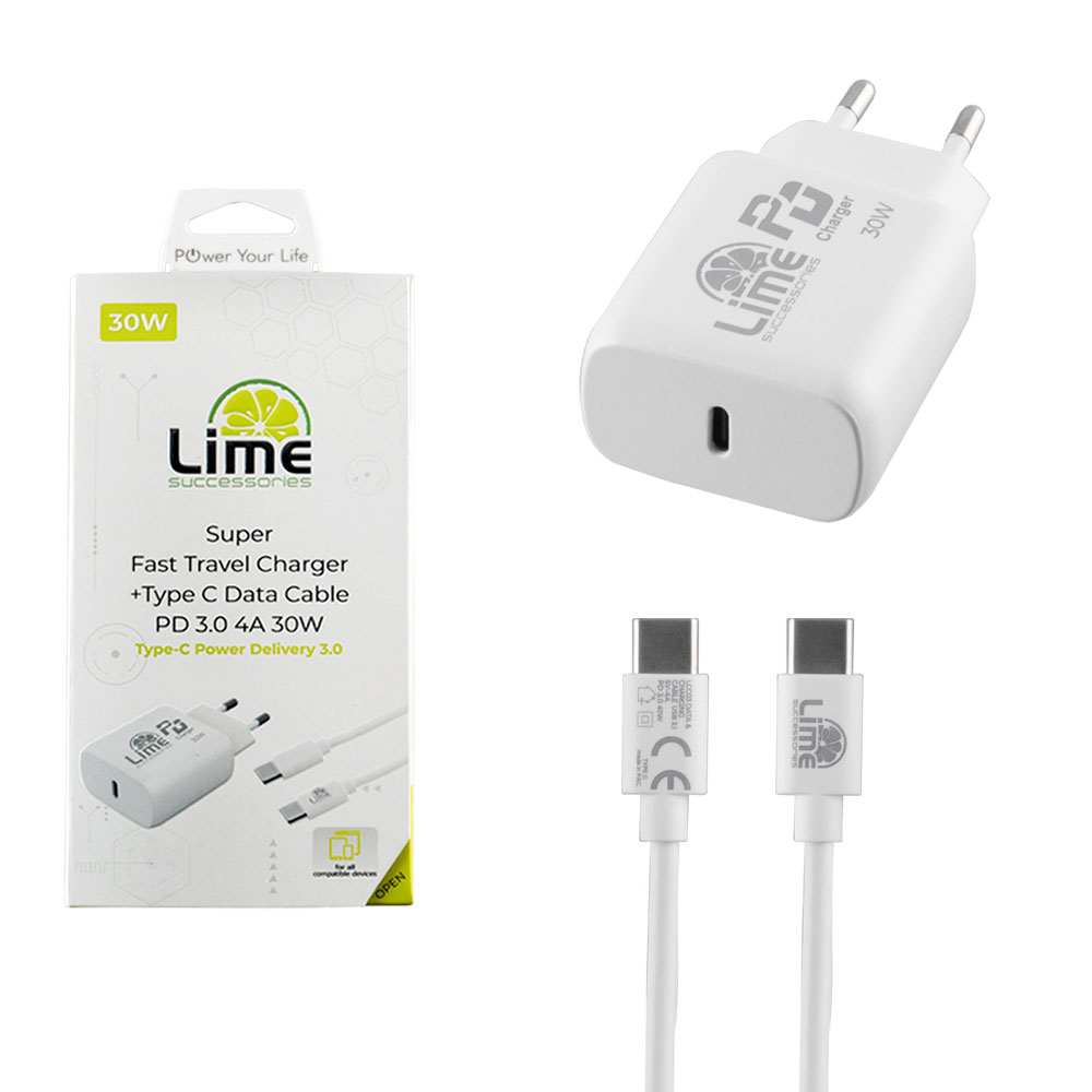 LIME TYPE C PD 3.0 SUPER FAST TRAVEL LTC30W 30W 4.0A + ΦΟΡΤΙΣΗΣ-DATA LCC03 TYPE C TO TYPE C 35W WHITE