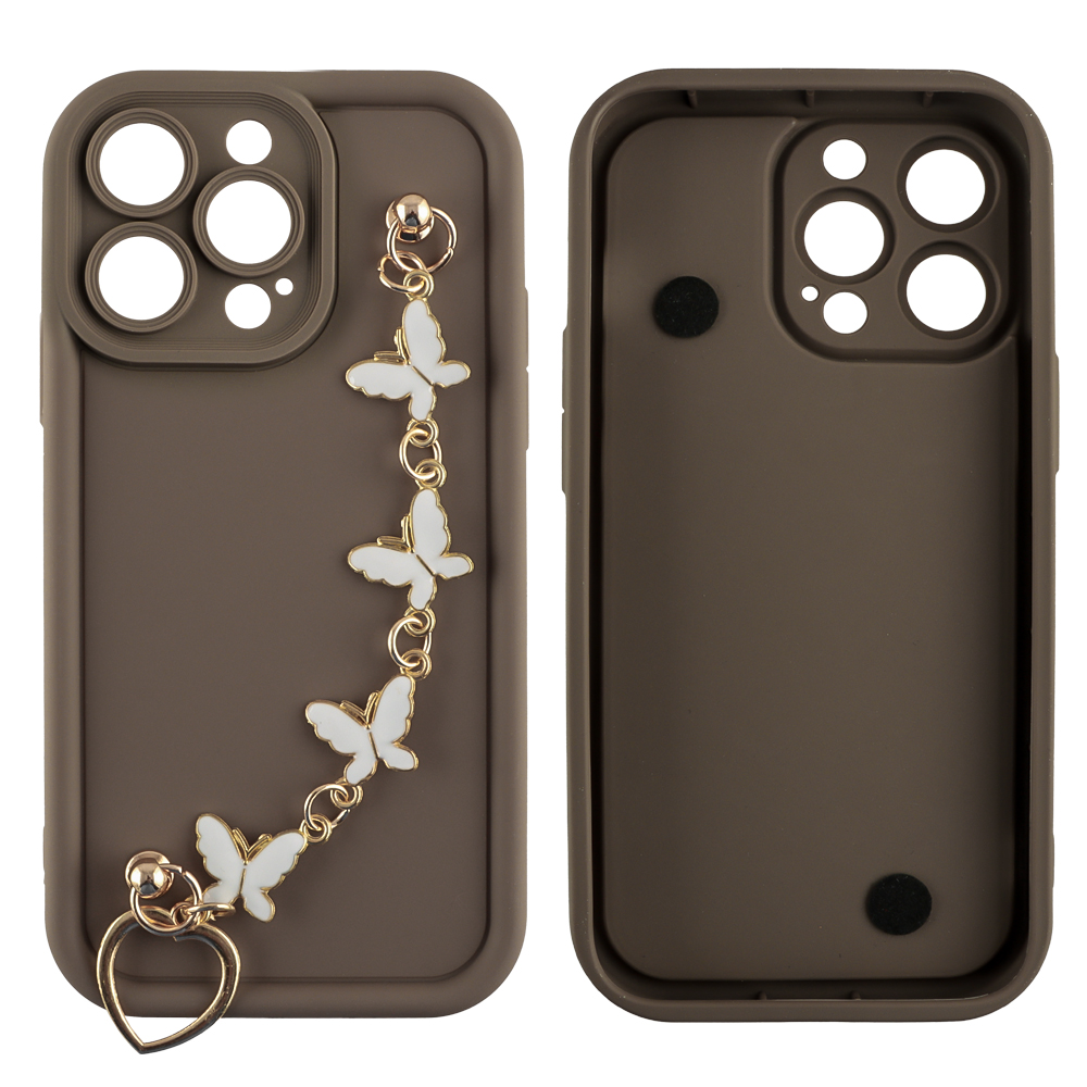 VOLTE-TEL ΘΗΚΗ IPHONE 13 PRO 6.1" SILICON TPU WITH STRAP FULL CAMERA PROTECTION BROWN WITH WHITE BUTTERFLIES