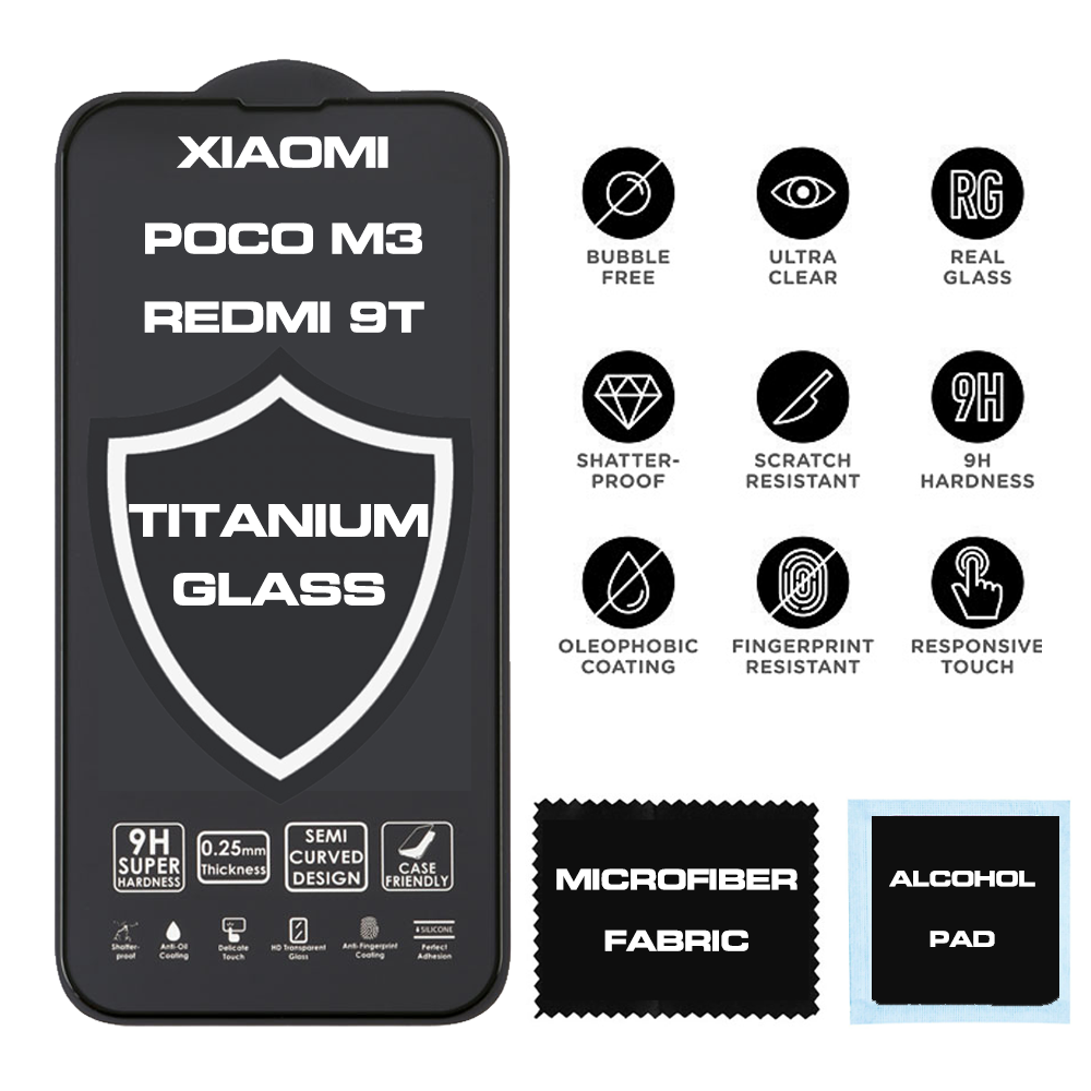TITANIUM TEMPERED GLASS XIAOMI POCO M3 / REDMI 9T 6.53" 9H 0.25mm FULL FACE FULL GLUE SEMI CURVED BLACK