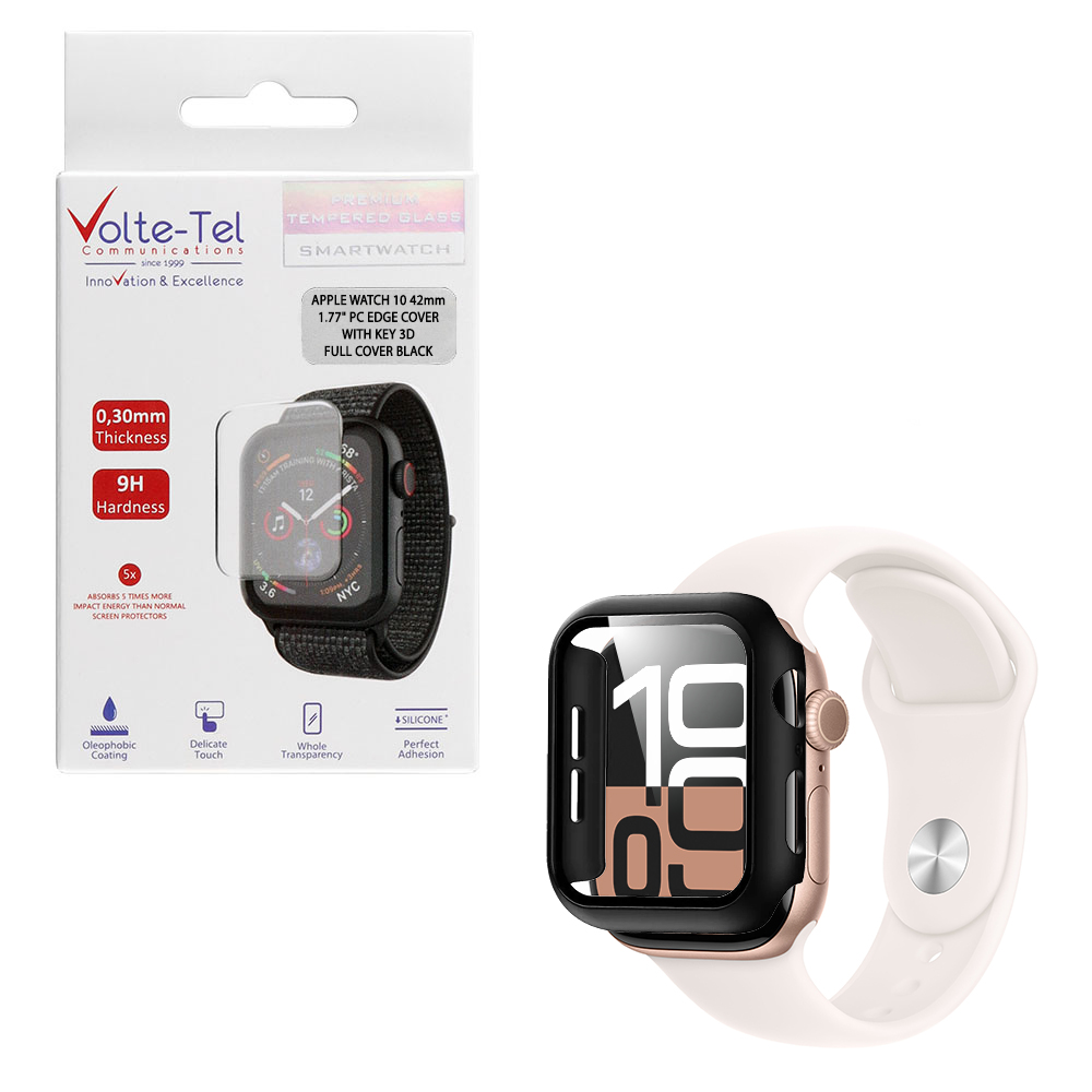 VOLTE-TEL TEMPERED GLASS APPLE WATCH 10 42mm 1.77" 9H 0.30mm PC EDGE COVER WITH KEY 3D FULL GLUE FULL COVER BLACK